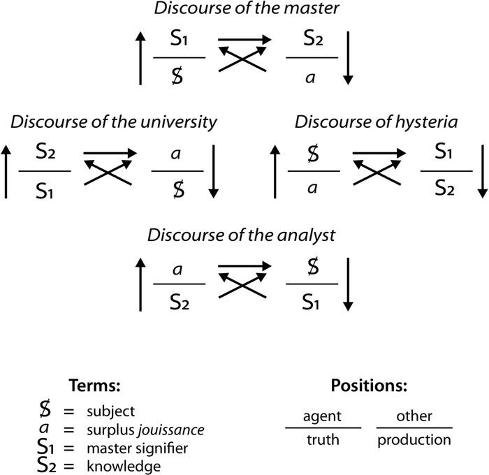You may be wondering, why these four? What about others? Where did this come from? What I’m doing here, which is the entire subtext of the post, is rendering the structure of Lacan’s 4 discourses into a form that might resonate with a general reader, by focusing specifically on the structure of the subject within each discourse.